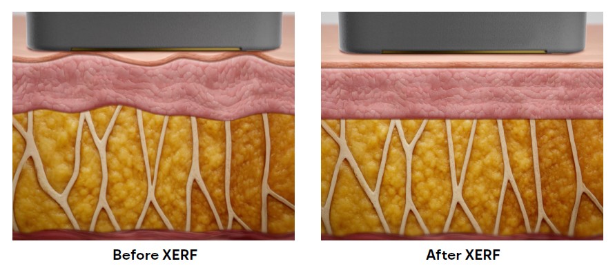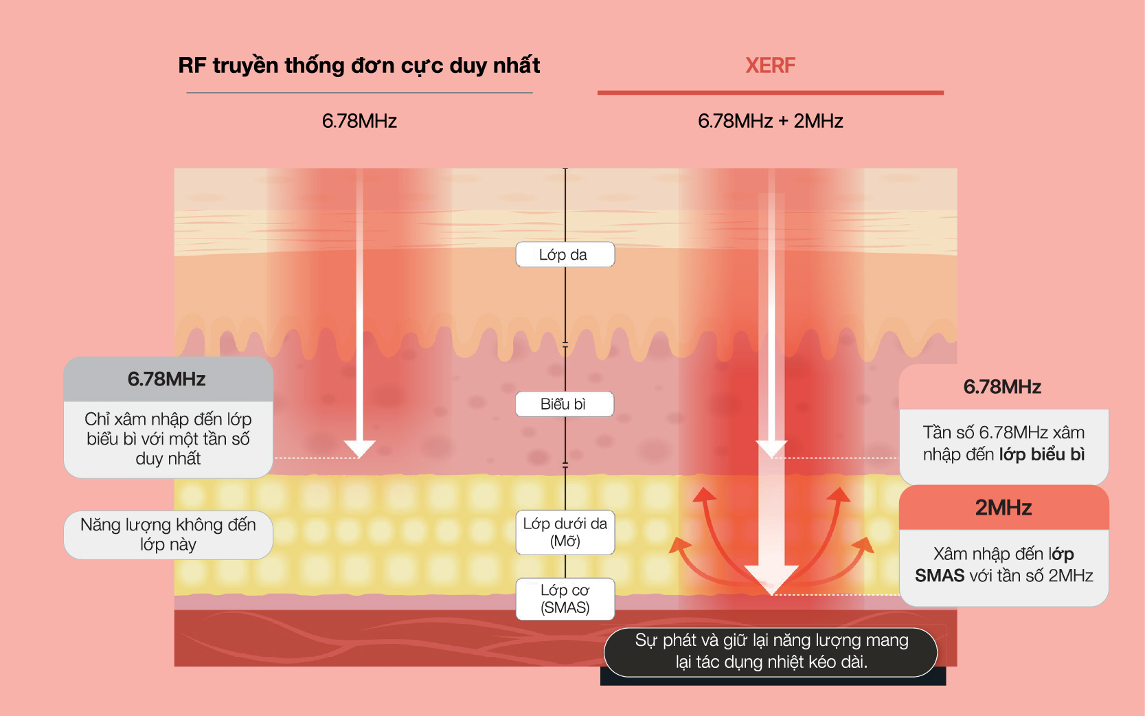 Khác với RF thông thường chỉ sử dụng một dải năng lượng, XERF kết hợp hai tần số 6.78 MHz và 2 MHz. Tần số cao 6.78 MHz tập trung cải thiện bề mặt, độ đàn hồi và kết cấu da, trong khi 2 MHz cho phép năng lượng đi sâu hơn, tác động vào lớp mô nâng đỡ. Việc phối hợp hai tần số giúp nhiệt RF không chỉ làm da căng mịn bên ngoài mà còn hỗ trợ nâng cơ từ nền mô bên trong, tạo nên hiệu quả trẻ hóa toàn diện hơn.